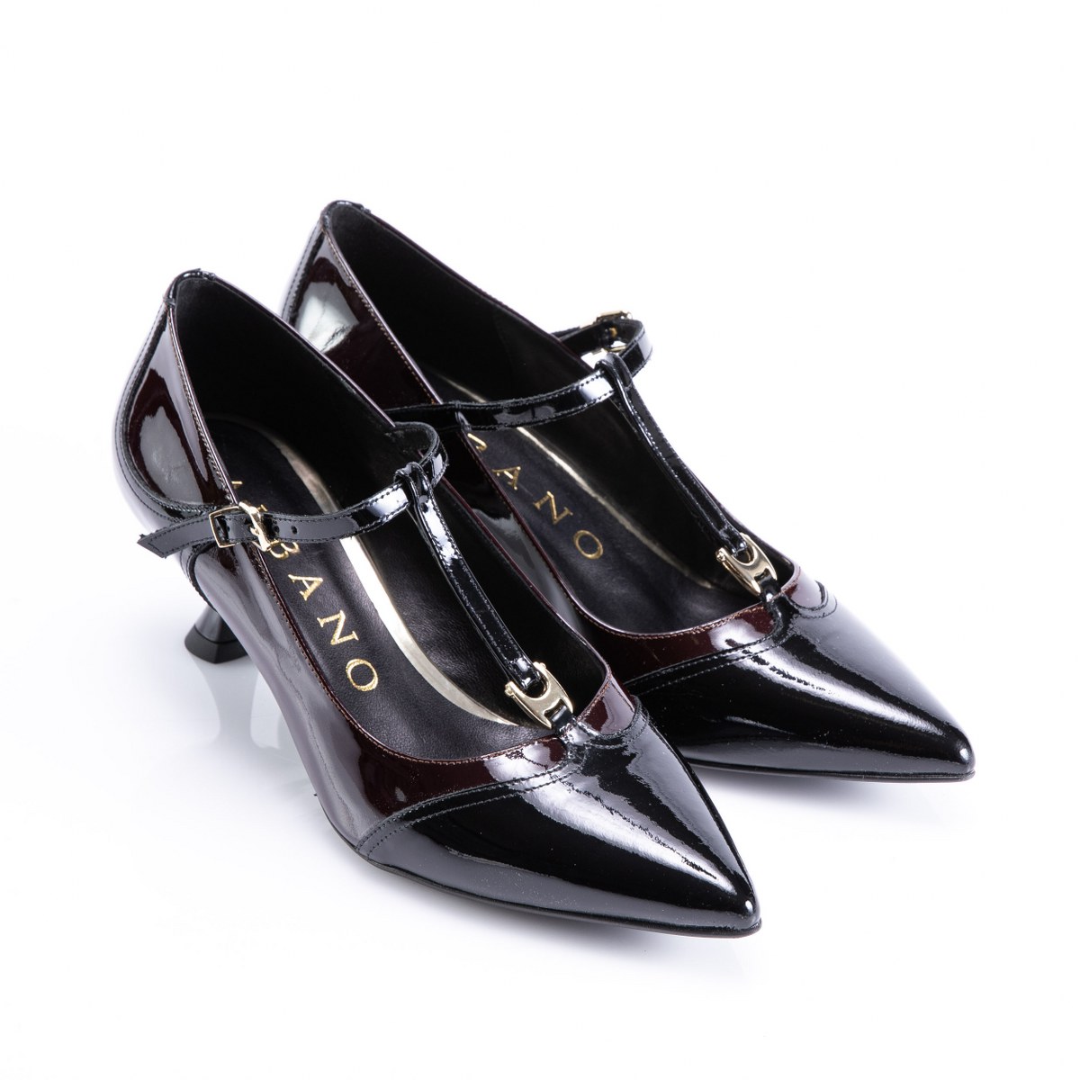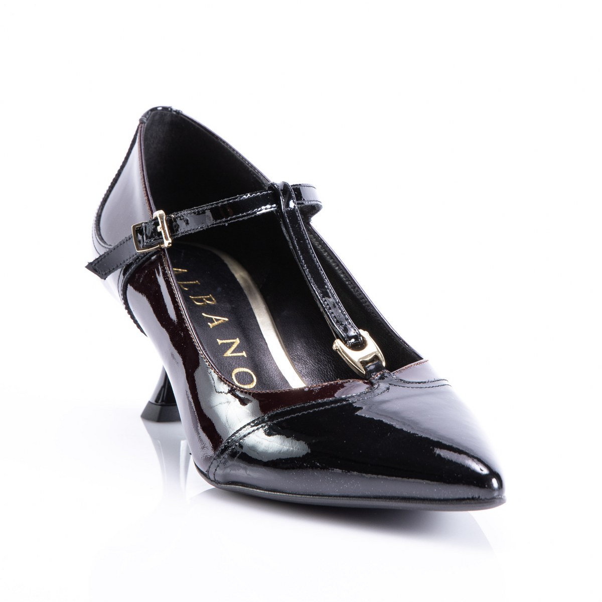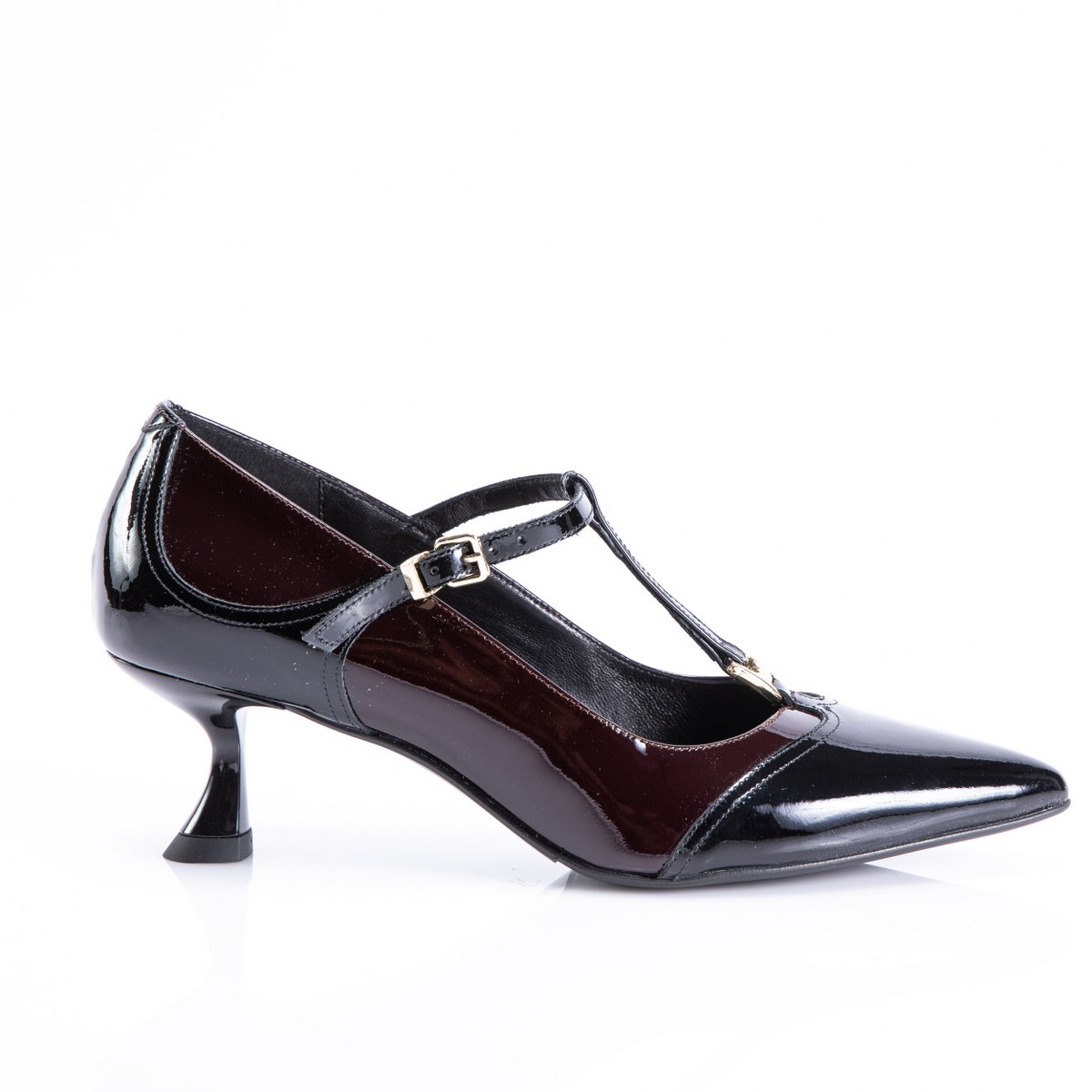 Pump in patent leather- front strap- heel 5- rubber sole.