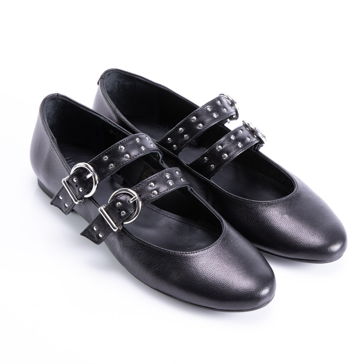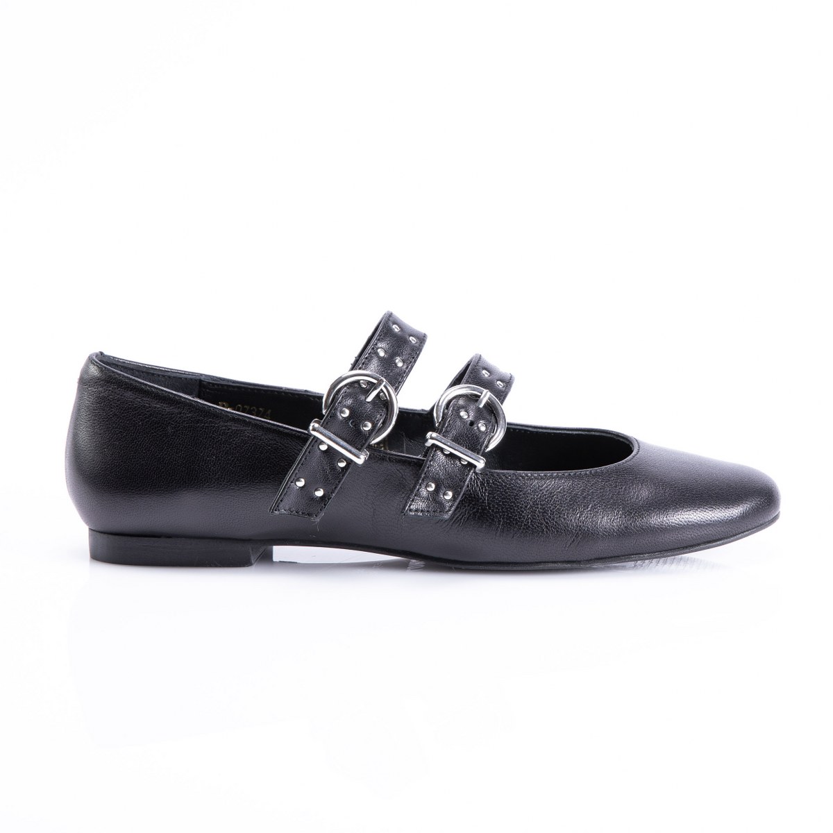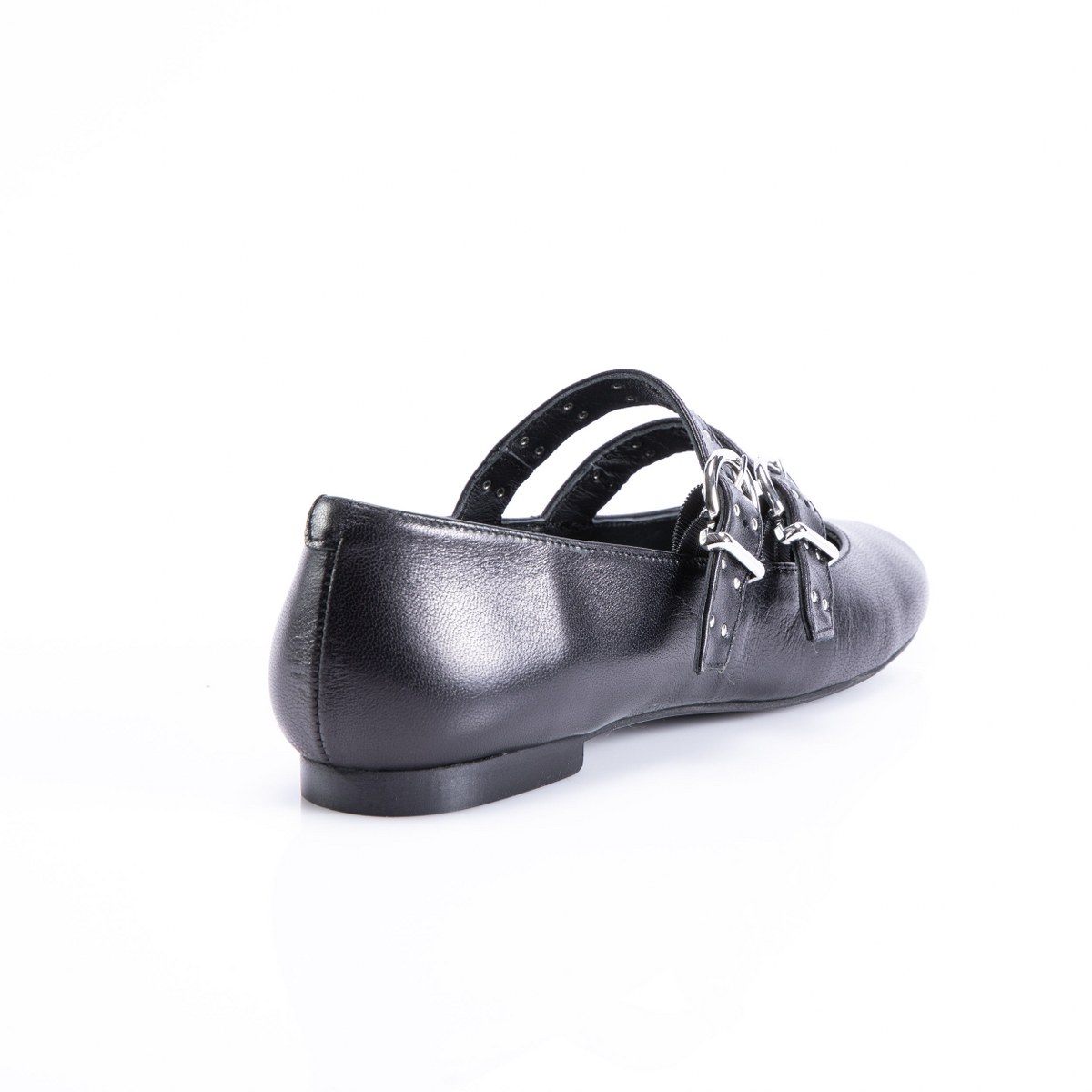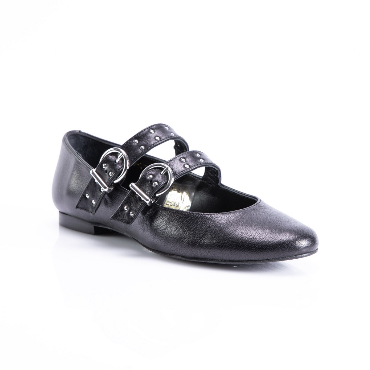Flat in leather- front straps- rubber sole.