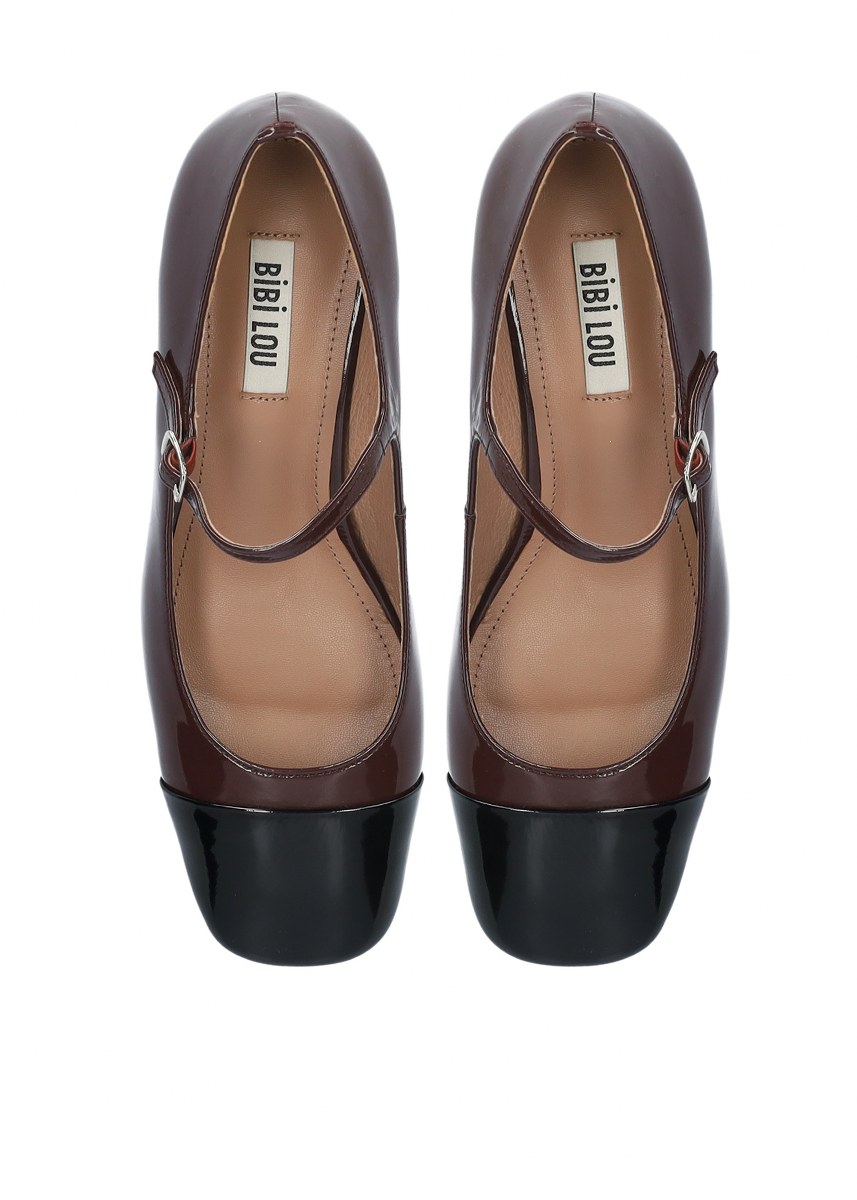 Pump in patent leather with ankle strap- heel 5- rubber sole.