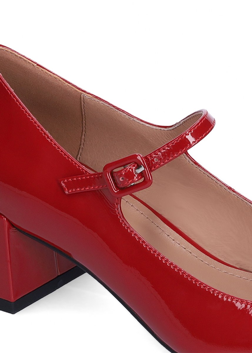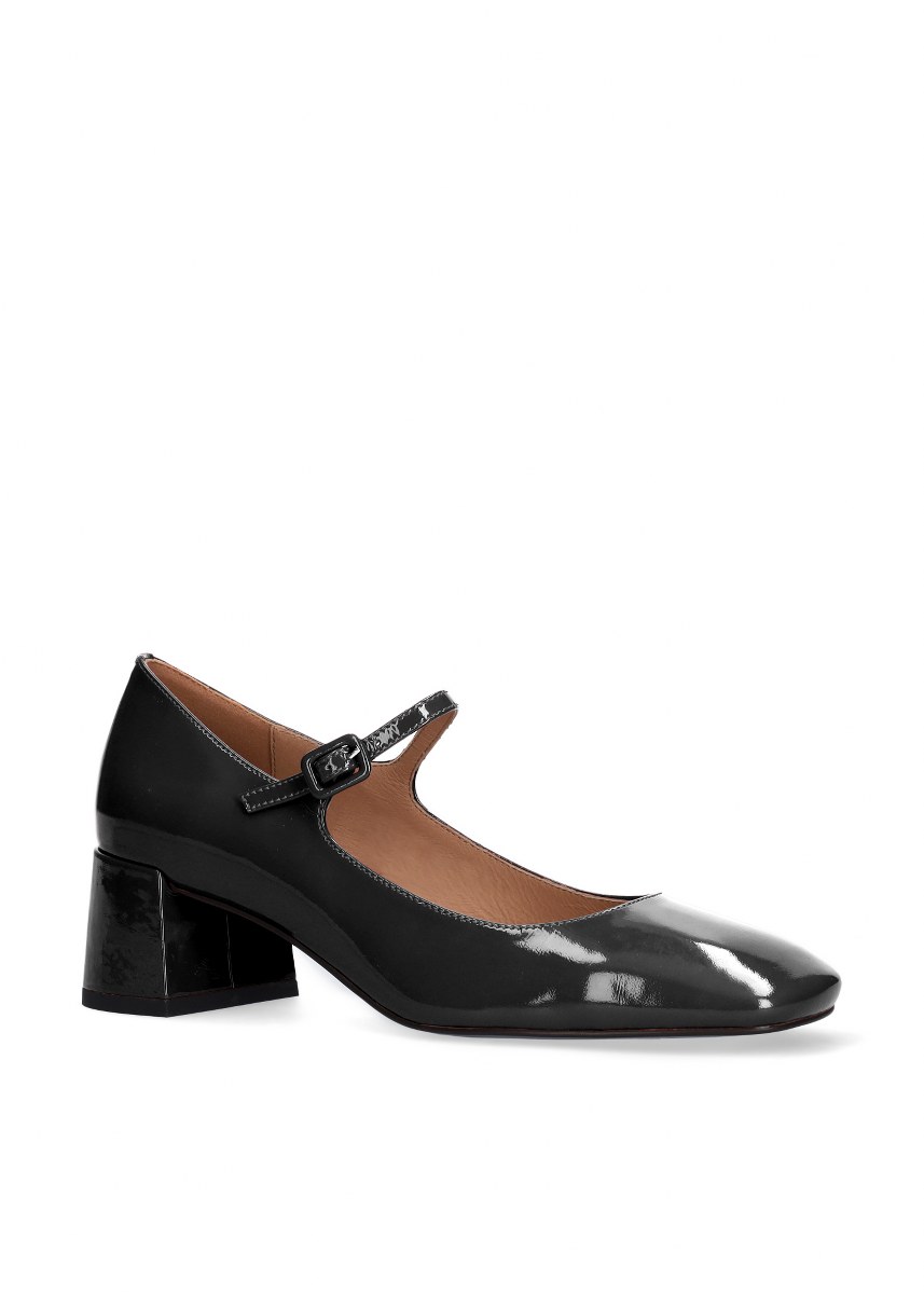 Pump in patent leather- front strap- heel 5- rubber sole.