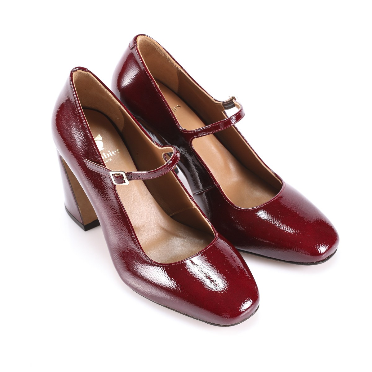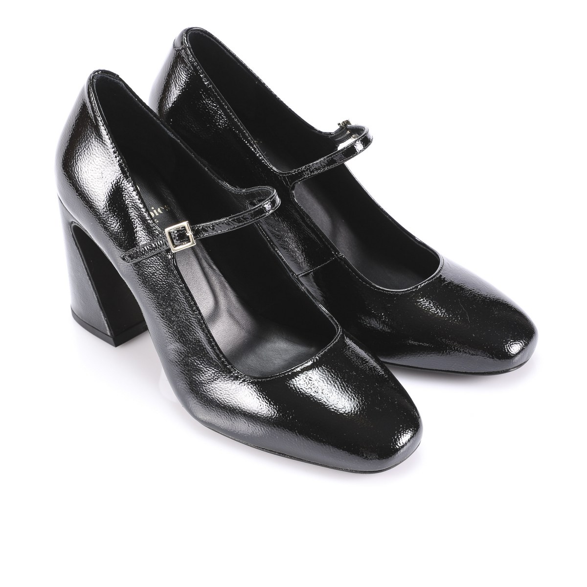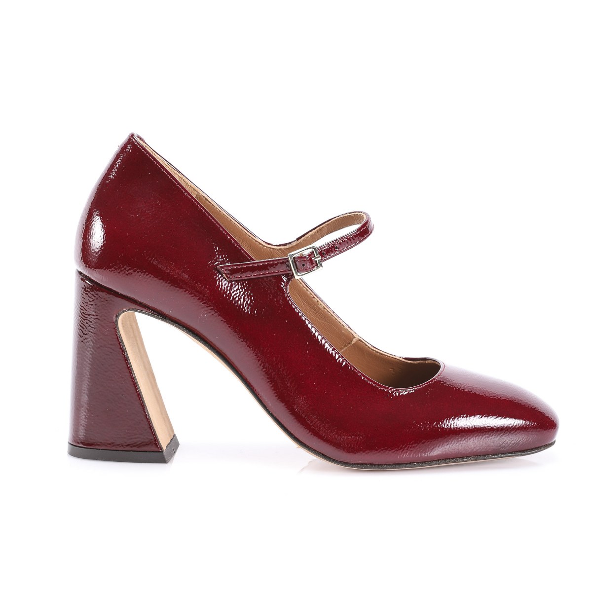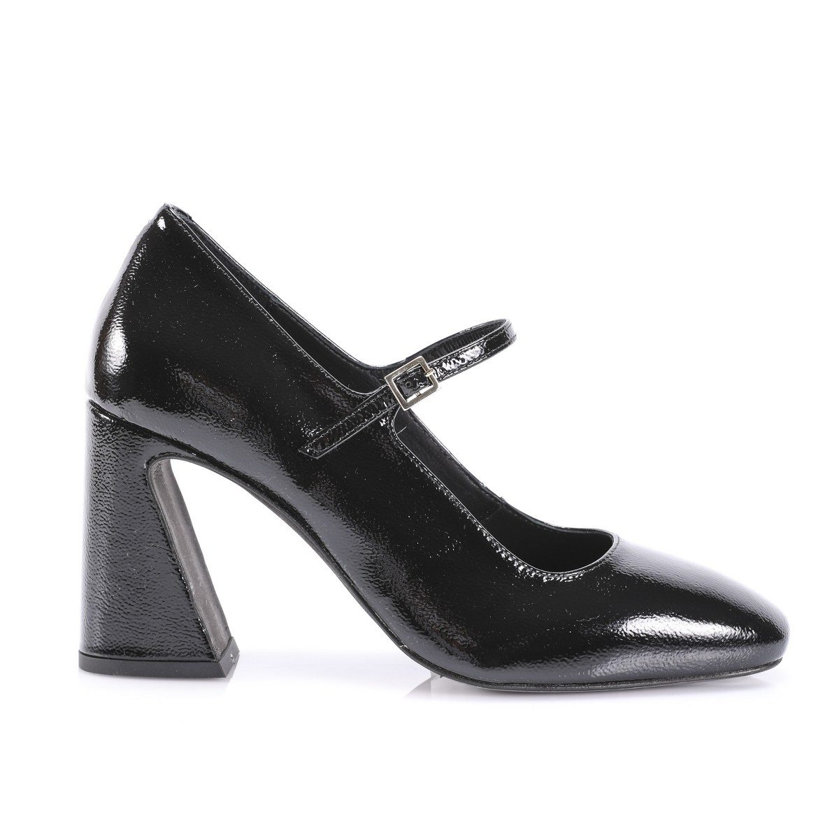 Pump in patent leather- front strap- heel 8- leather sole.