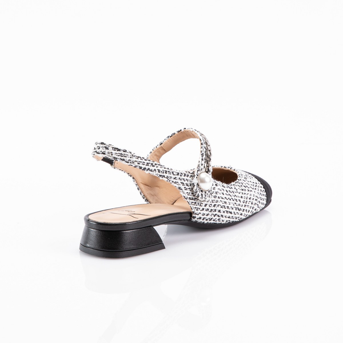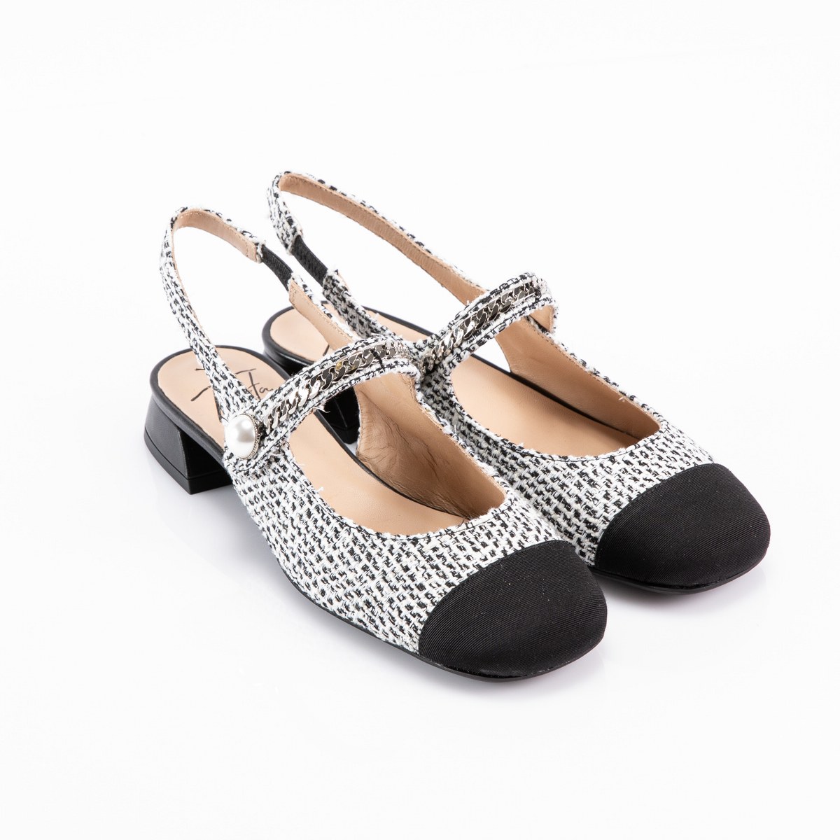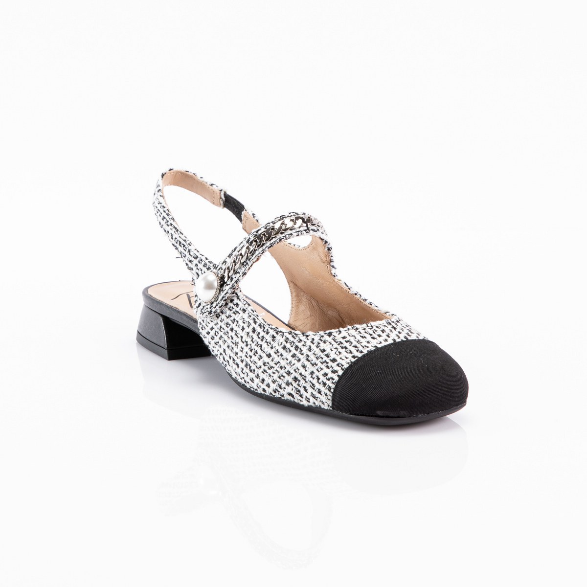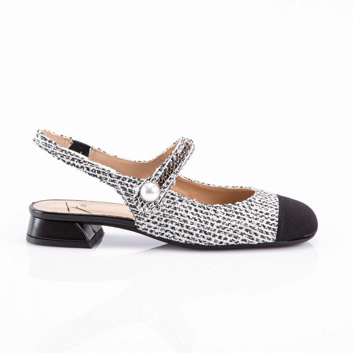 Pump in suede and fabric- front and back strap- heel 7- rubber sole.
