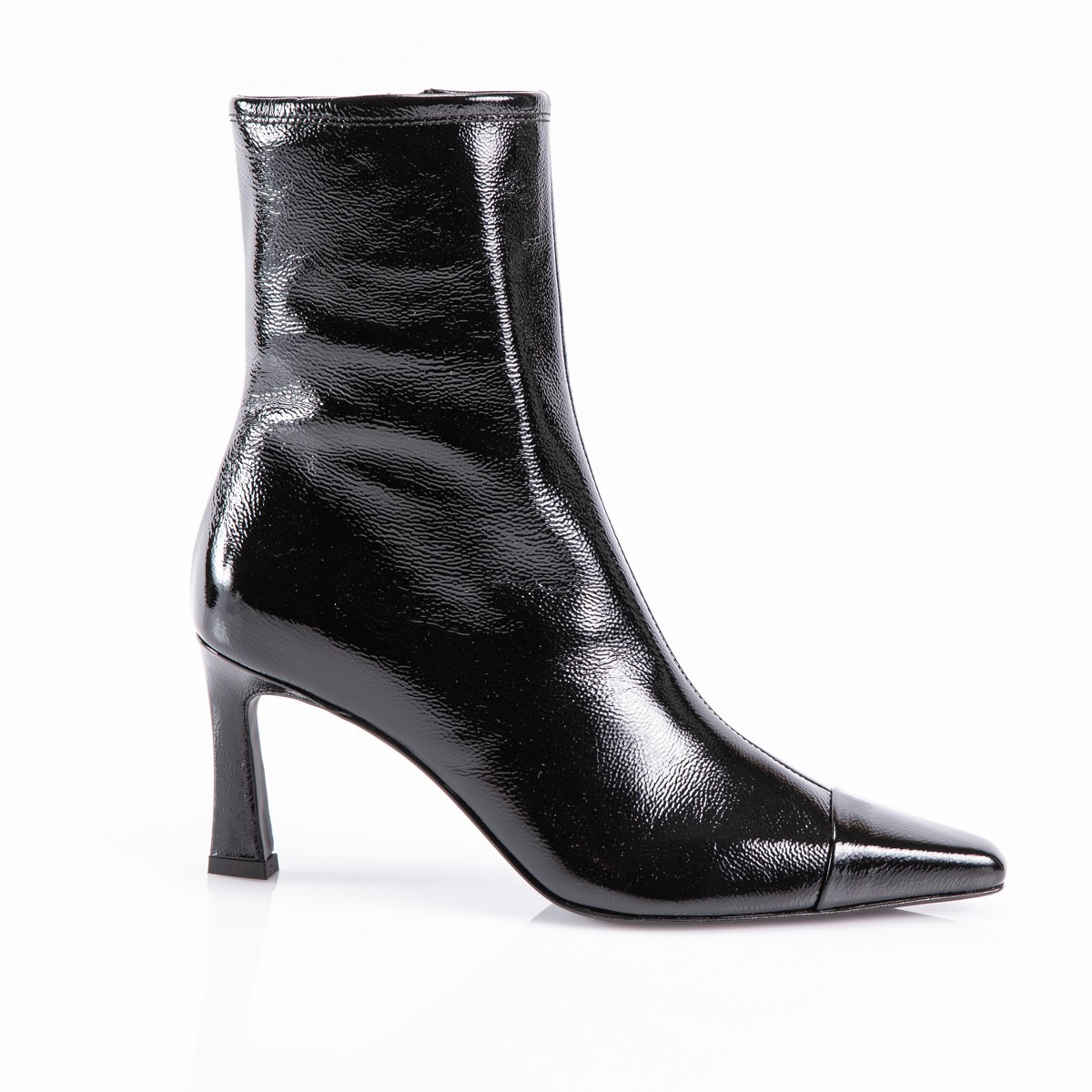 Low boot in shiny leather- side zip- heel 8- rubber sole.