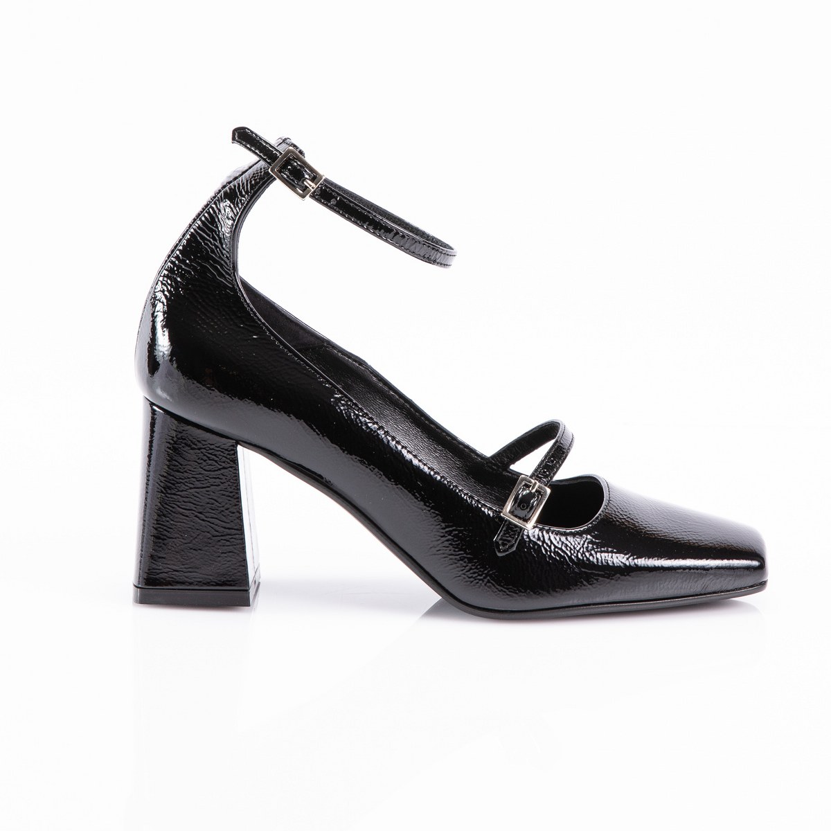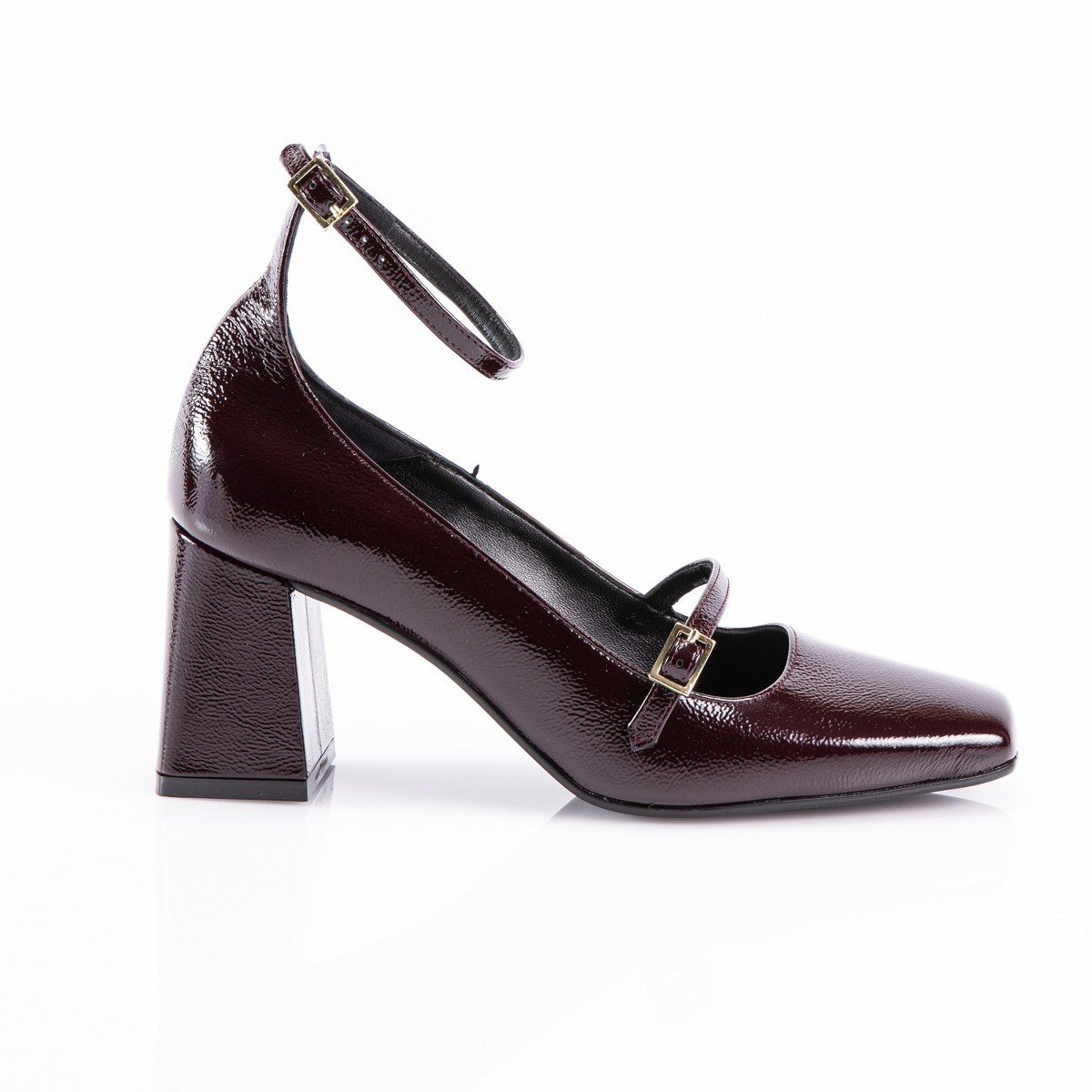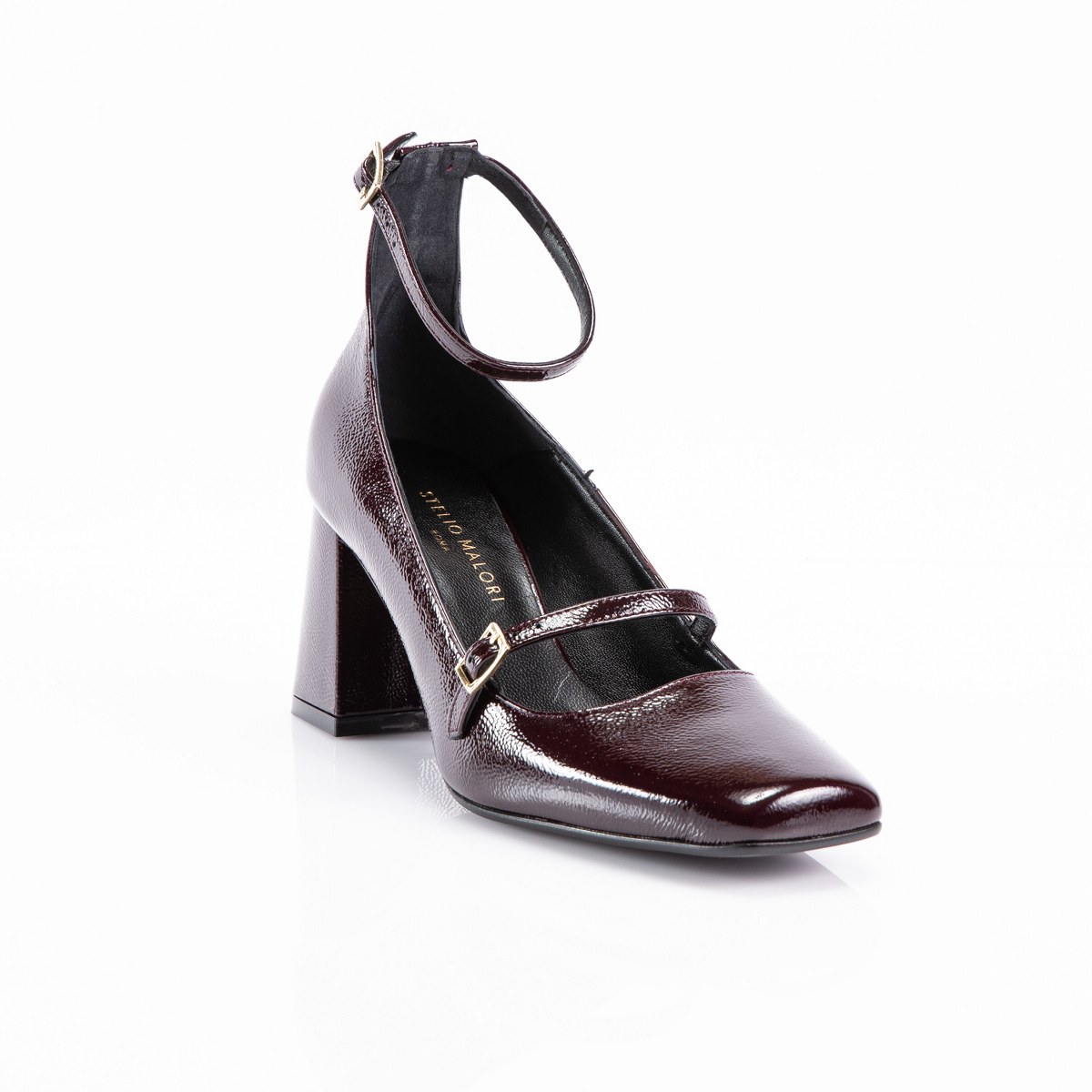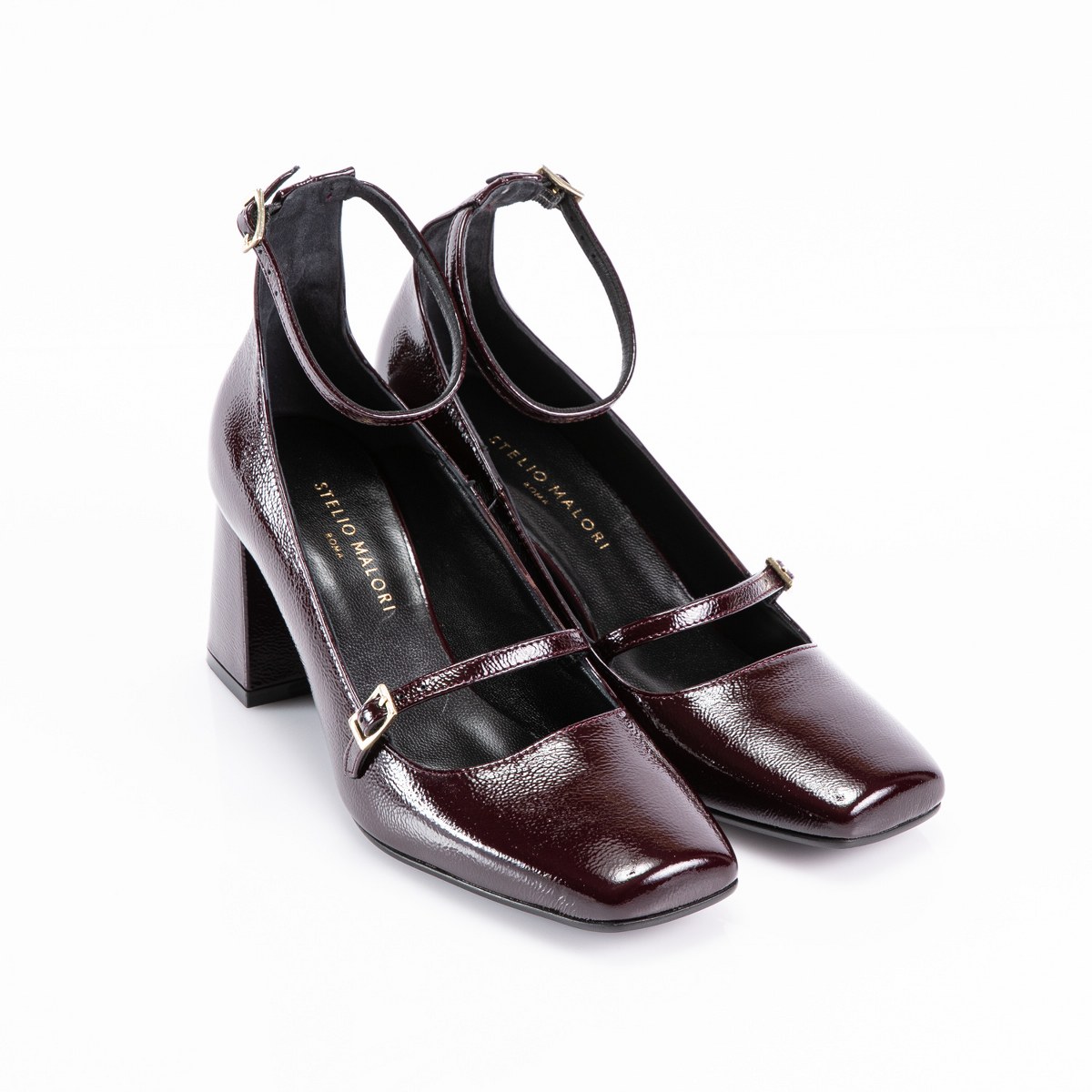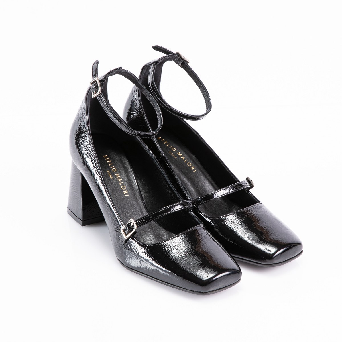 Pump in shiny leather- front and ankle strap- heel 8- rubber sole.