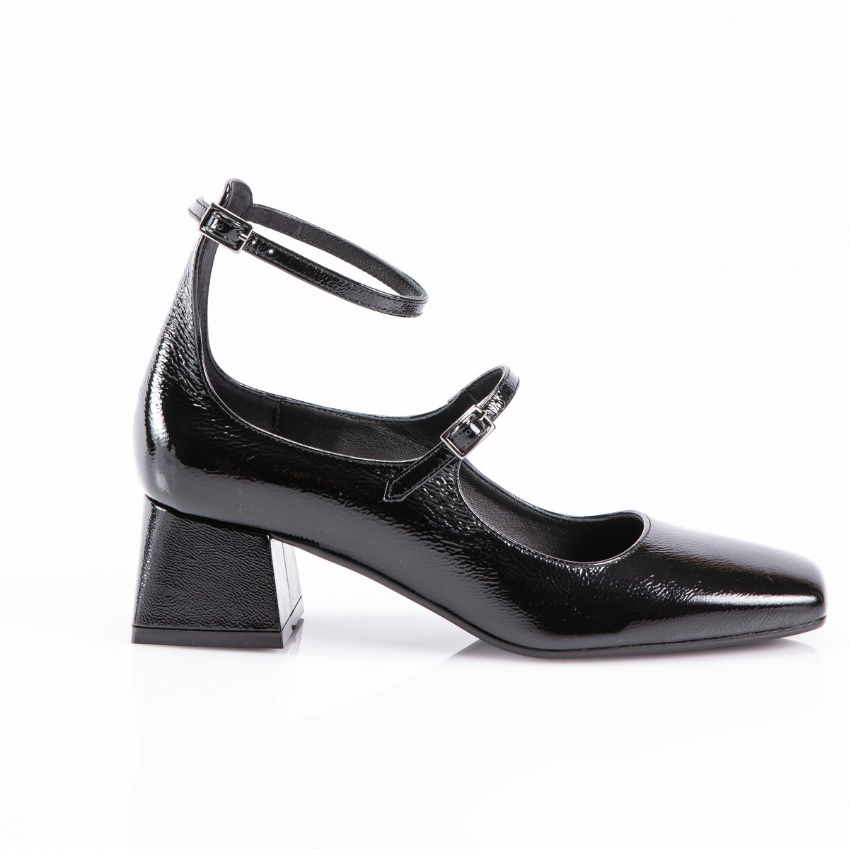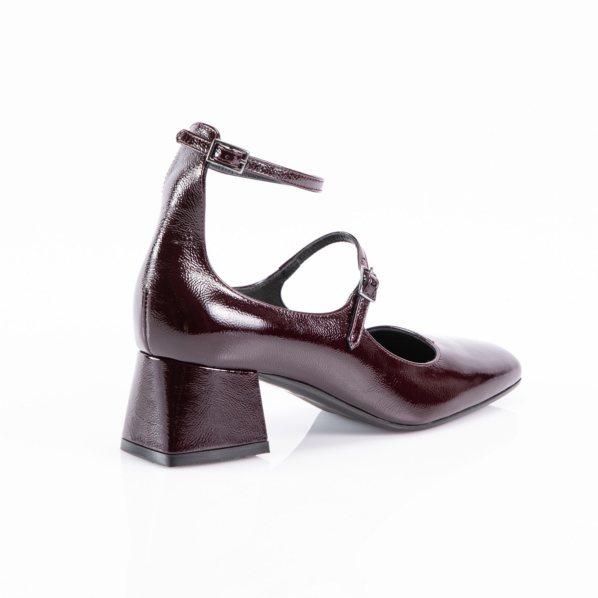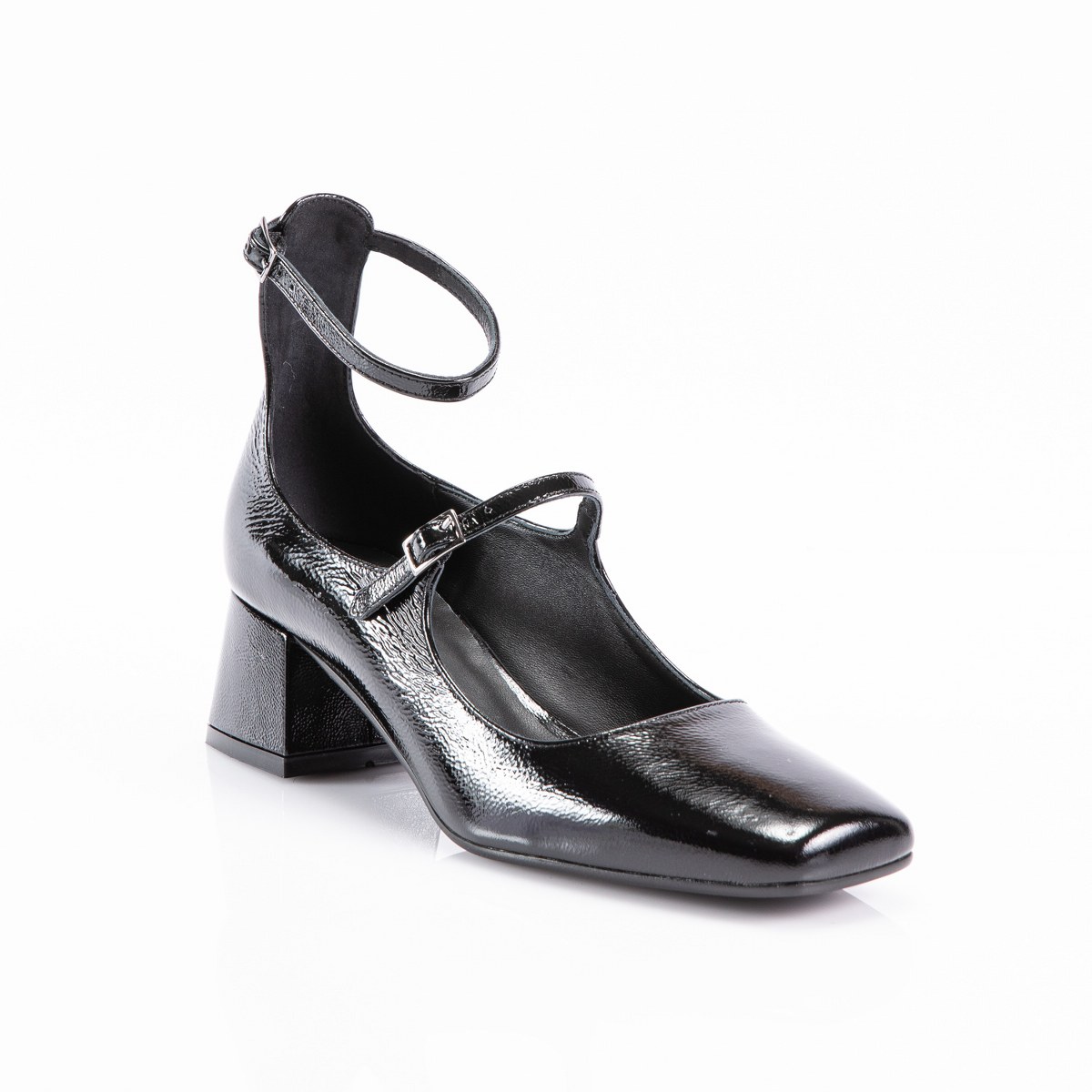 Pump in shiny leather- front and ankle strap- heel 5- rubber sole.
