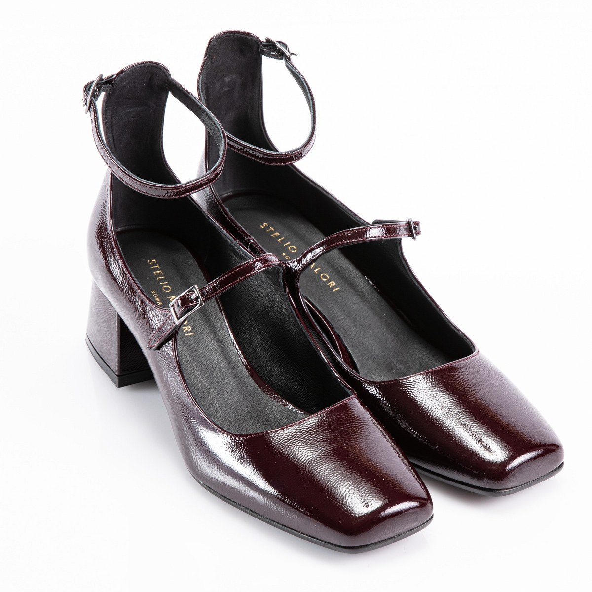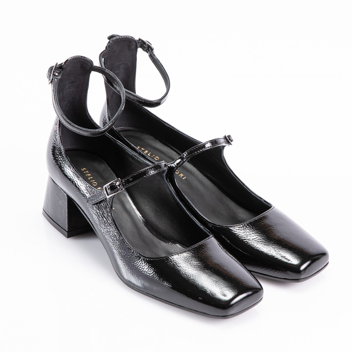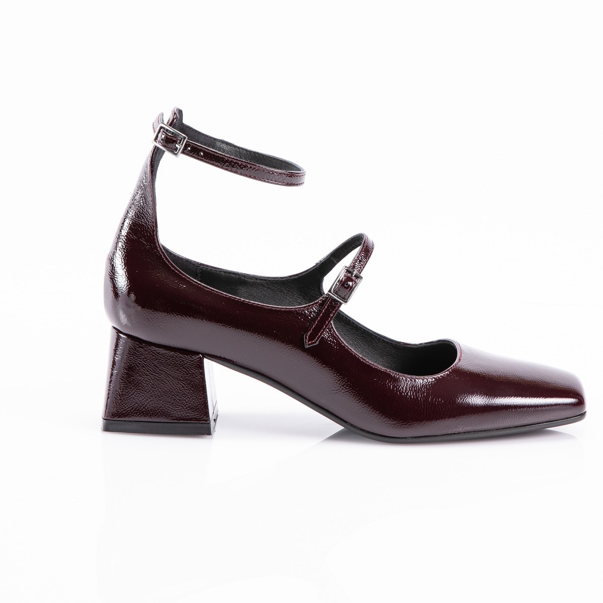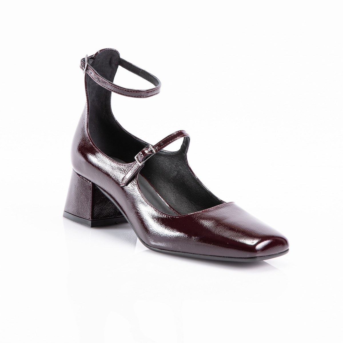 Pump in shiny leather- front and ankle strap- heel 5- rubber sole.