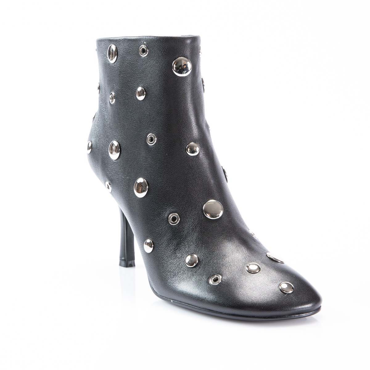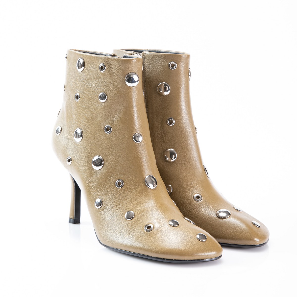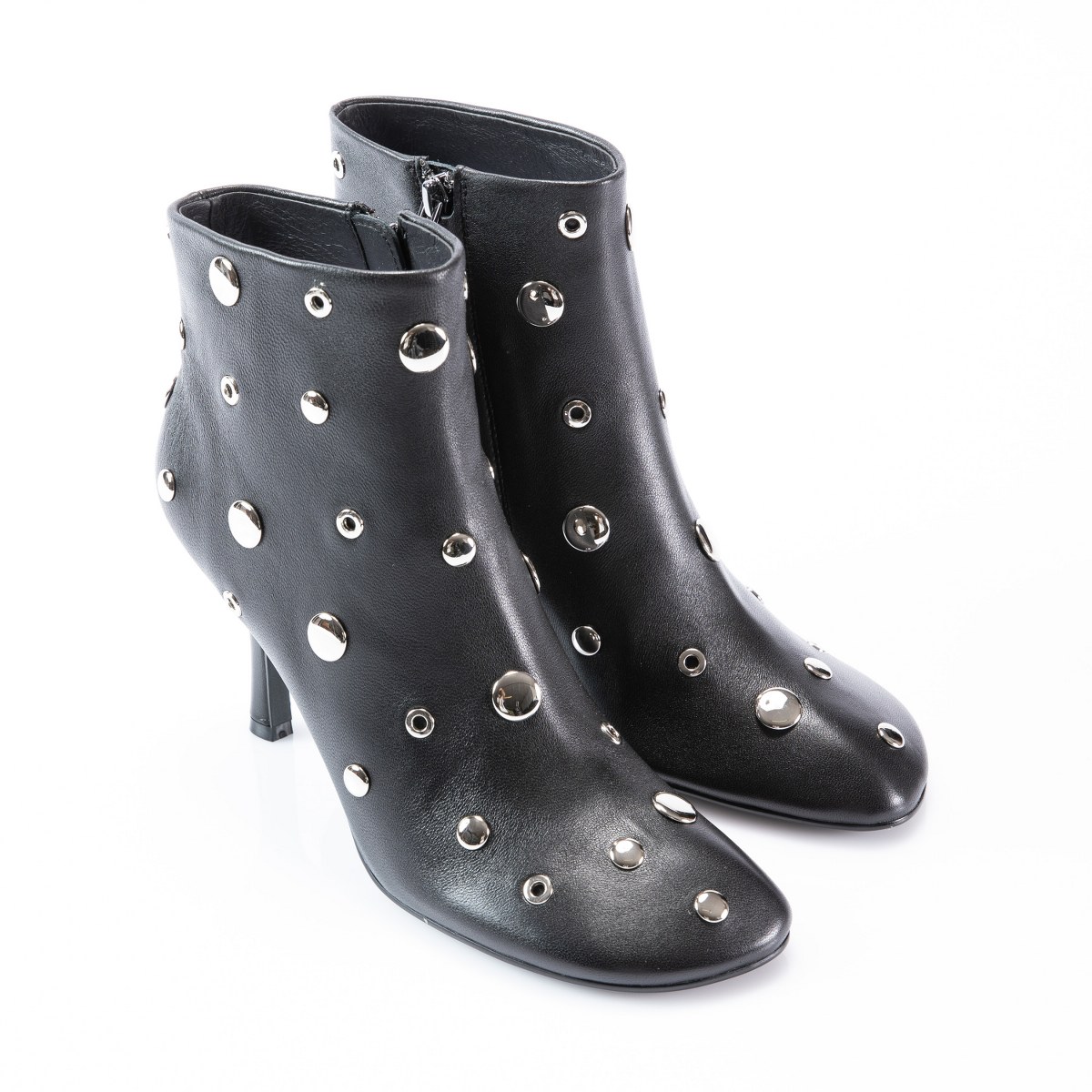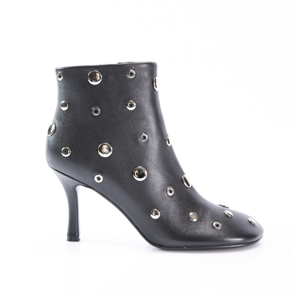 Low boot in leather- side zip- studs- heel 8- rubber sole.