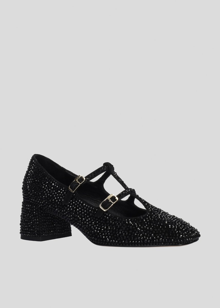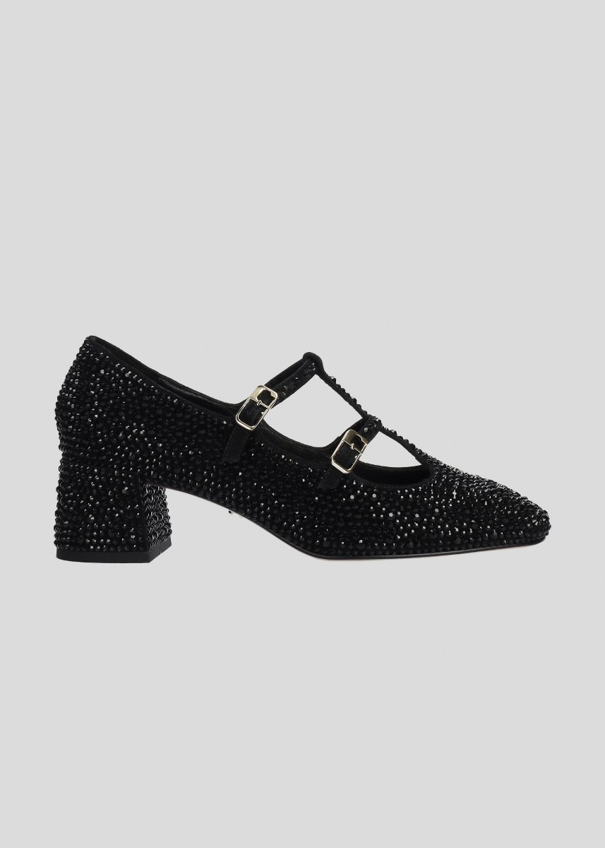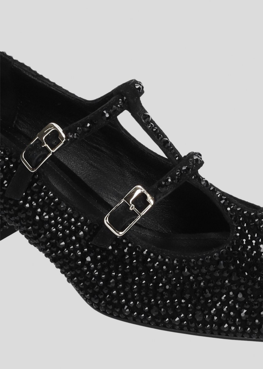 Pump in leather covered with strass- front straps- heel 5- rubber sole.