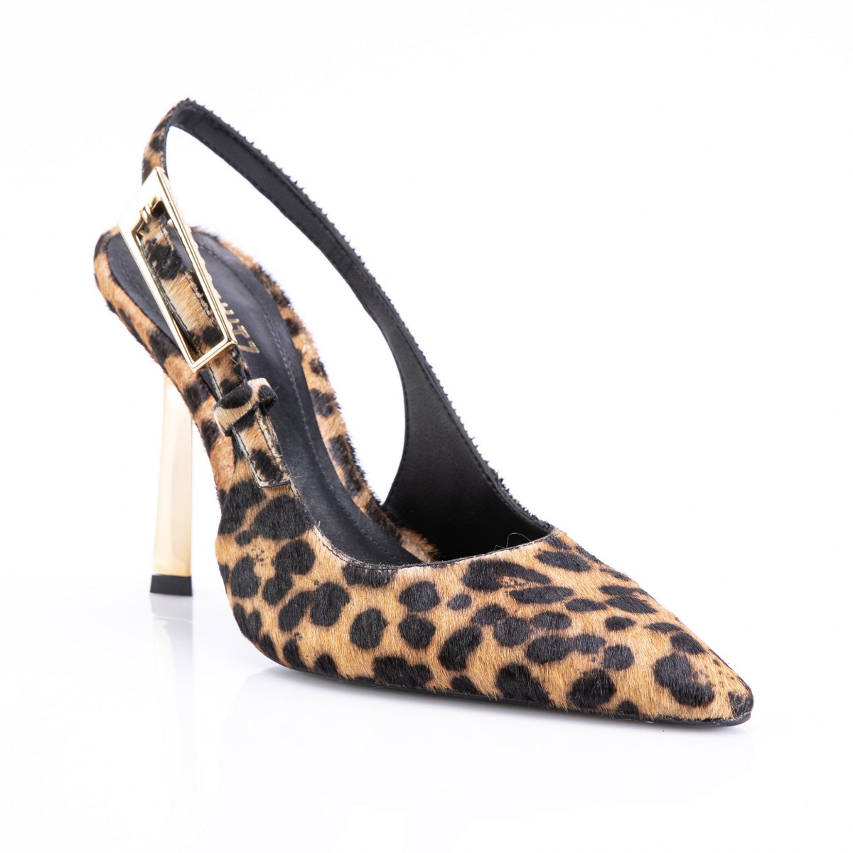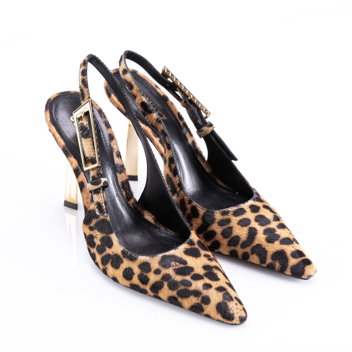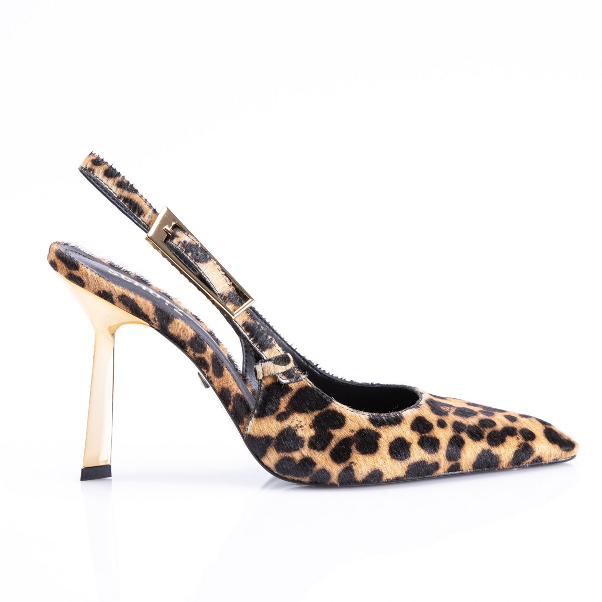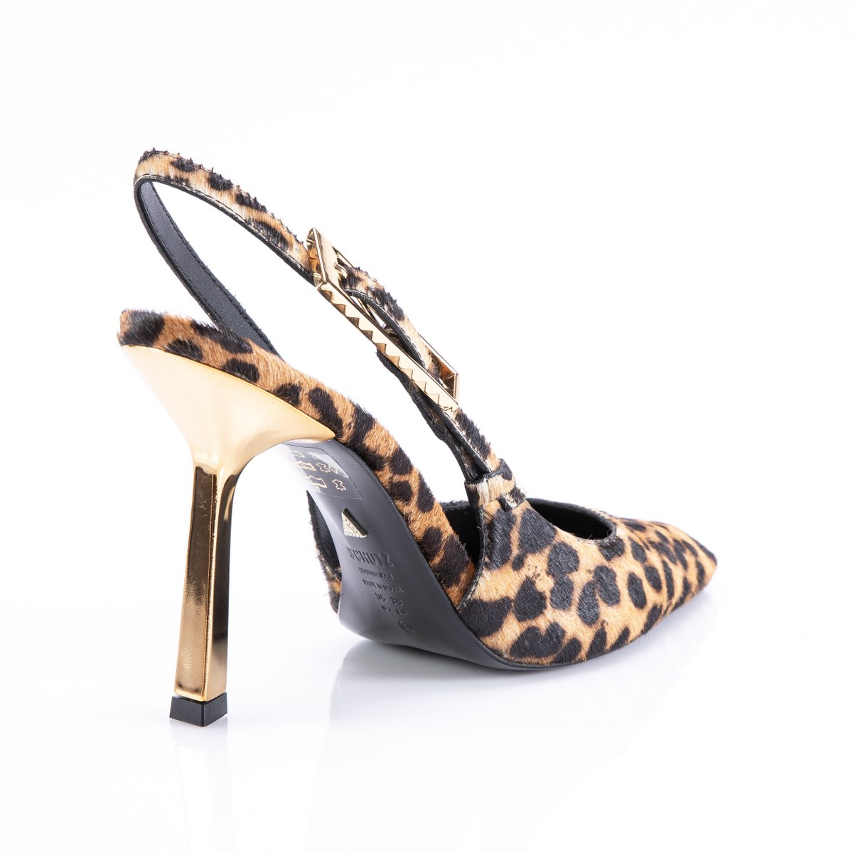 Pump in poney back strap- metallic gold heel 11- leather sole.